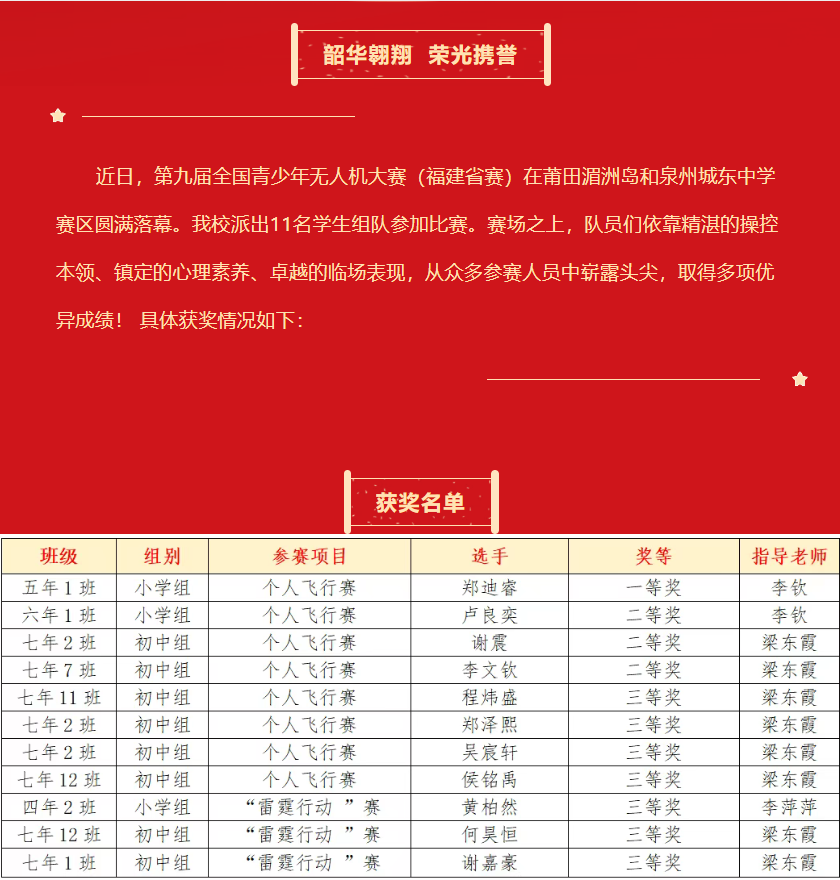 【喜报】“韶华翱翔,荣光携誉”——恭喜莆田砺志学校在第九届全国青少年无人机大赛(福建省赛)获得佳绩!