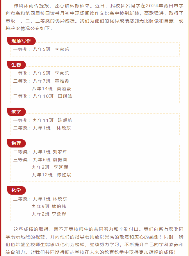 百舸争流显身手,学科竞赛展风采——莆田砺志学校多位学生在2024年莆田市初中学科竞赛中获奖