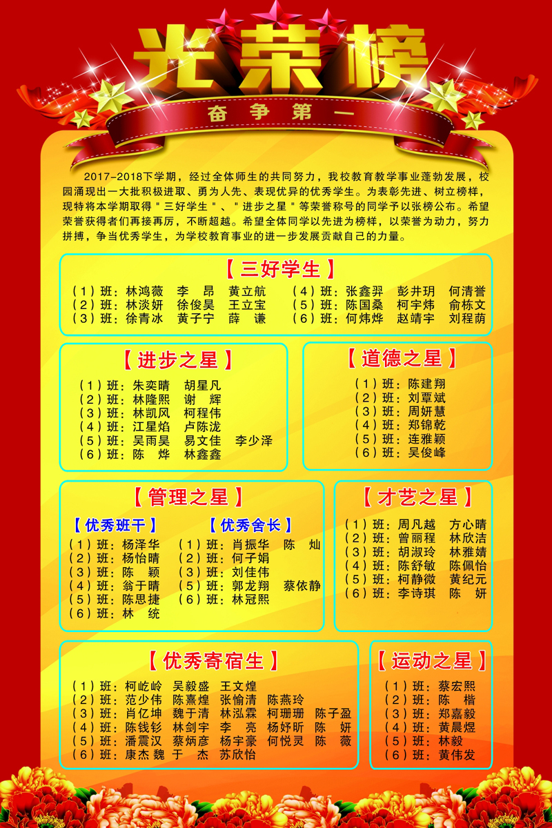 2017--2018学年下学期,经过全体师生的共同努力,我校教育教学事业蓬勃发展,校园涌现出一大批积极进取、勇为人先、表现优异的优秀学生。为表彰先进、树立榜样,,现特将本学期取得“三好学生”、“进步之星”等荣誉称号的同学予以张榜公布。希望荣誉获得者们再接再厉,不断超越。希望全体同学以先进为榜样,以荣誉为动力,努力拼搏,争当优秀学生,为学校教育事业的进一步发展贡献自己的为量。