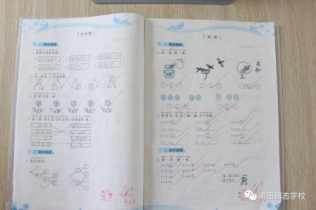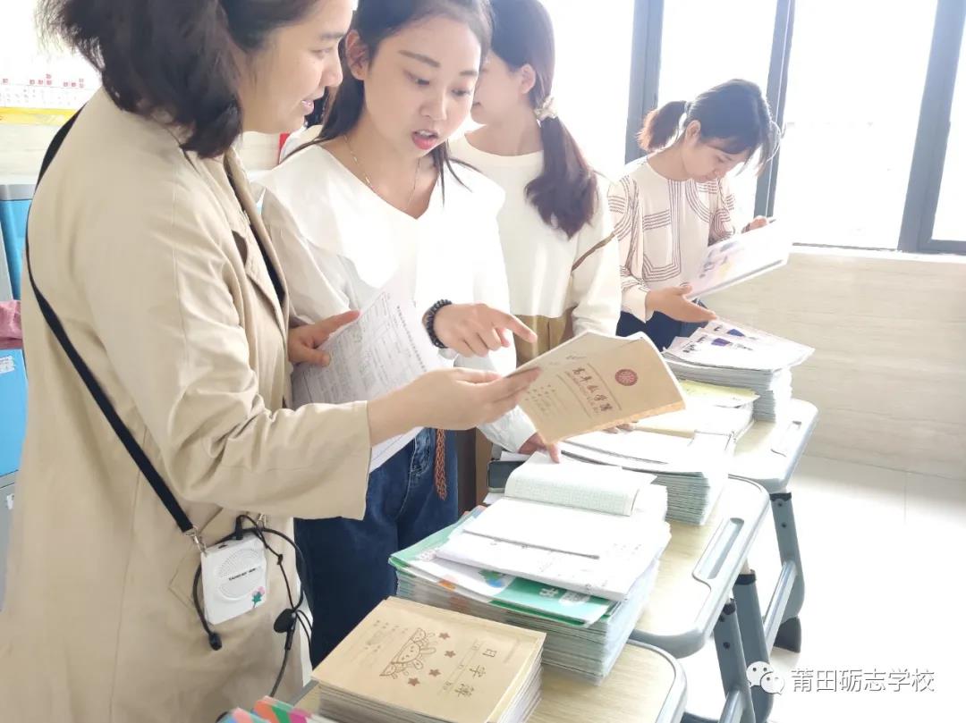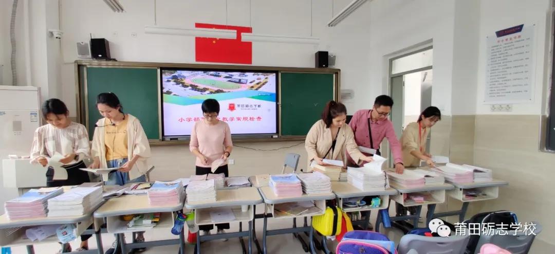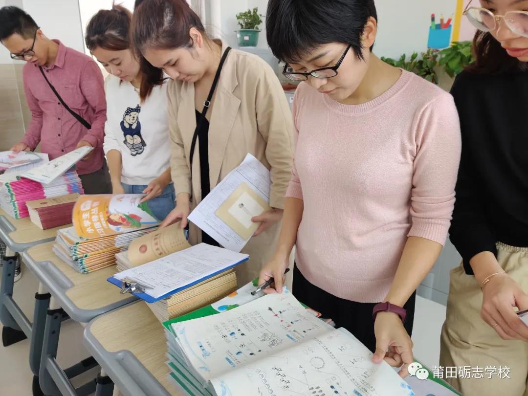 教师们步入小学部教室,按照教学常规检查的各项要求,对学生的各科作业本、试卷进行检查。