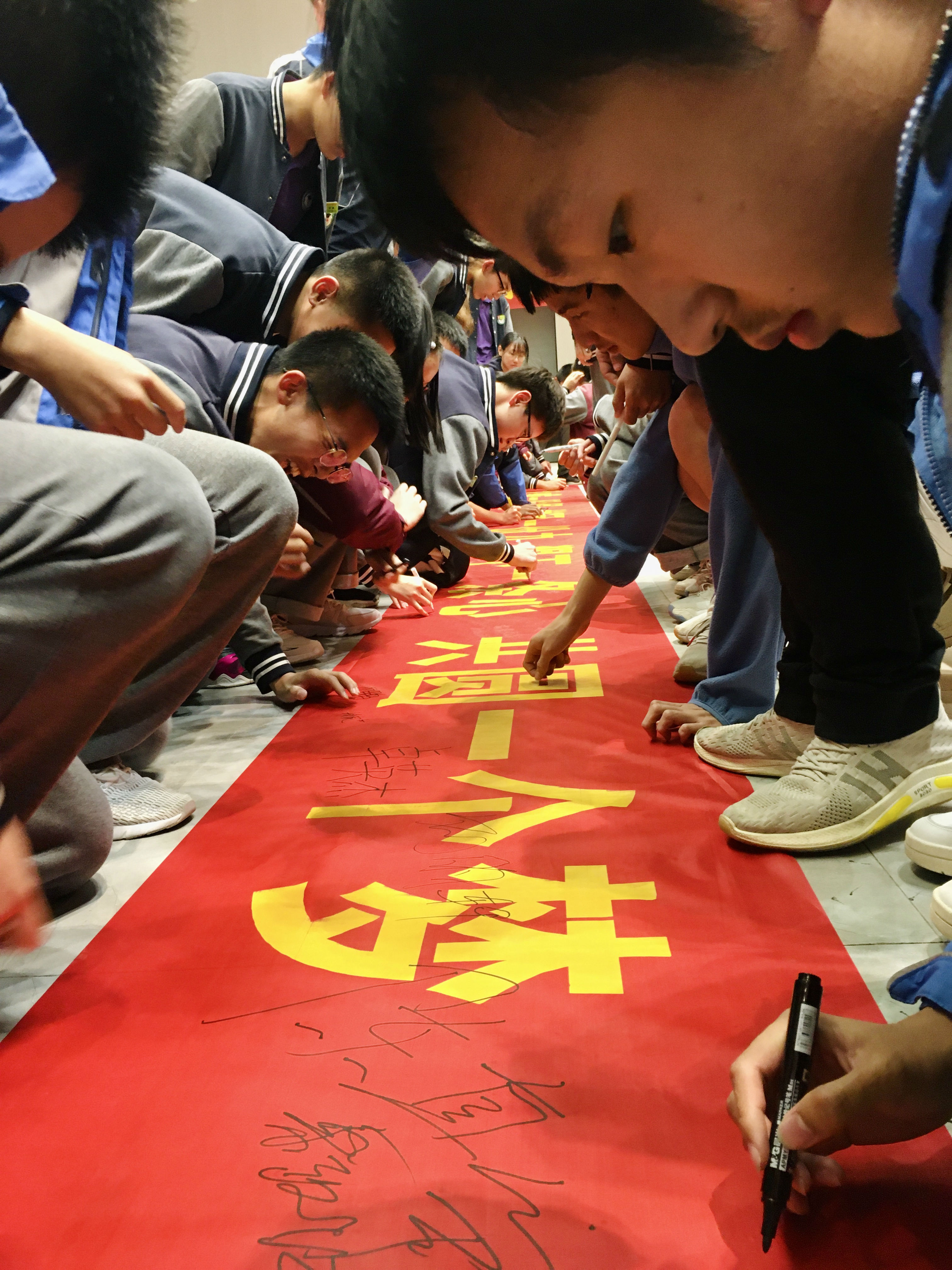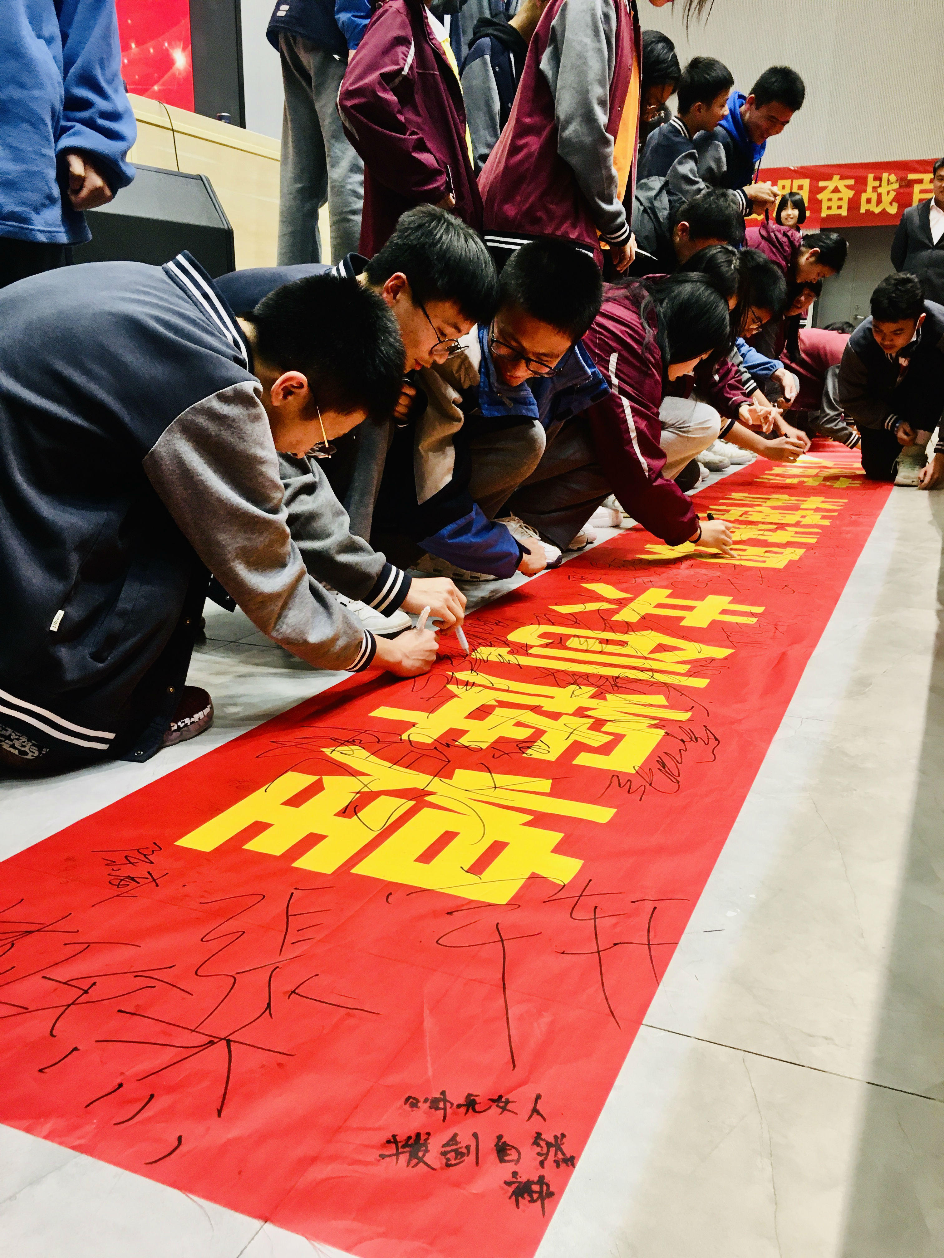 同学们的铮铮誓言划破天空,震撼大地!誓言即出,就应该铭记在心!誓言即出,就应该用行动证明!九年级全体学生在横幅上签下姓名,许下承诺。