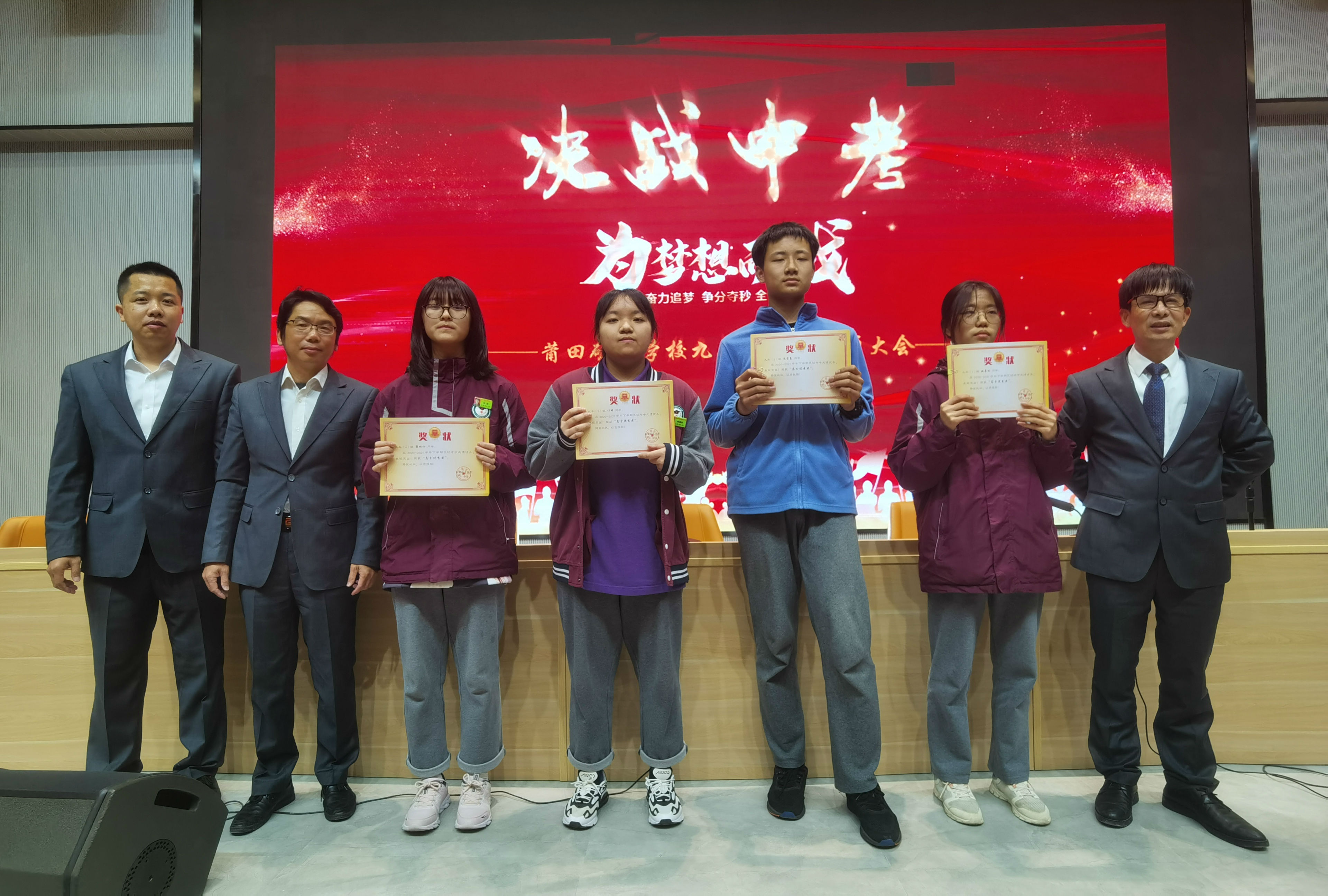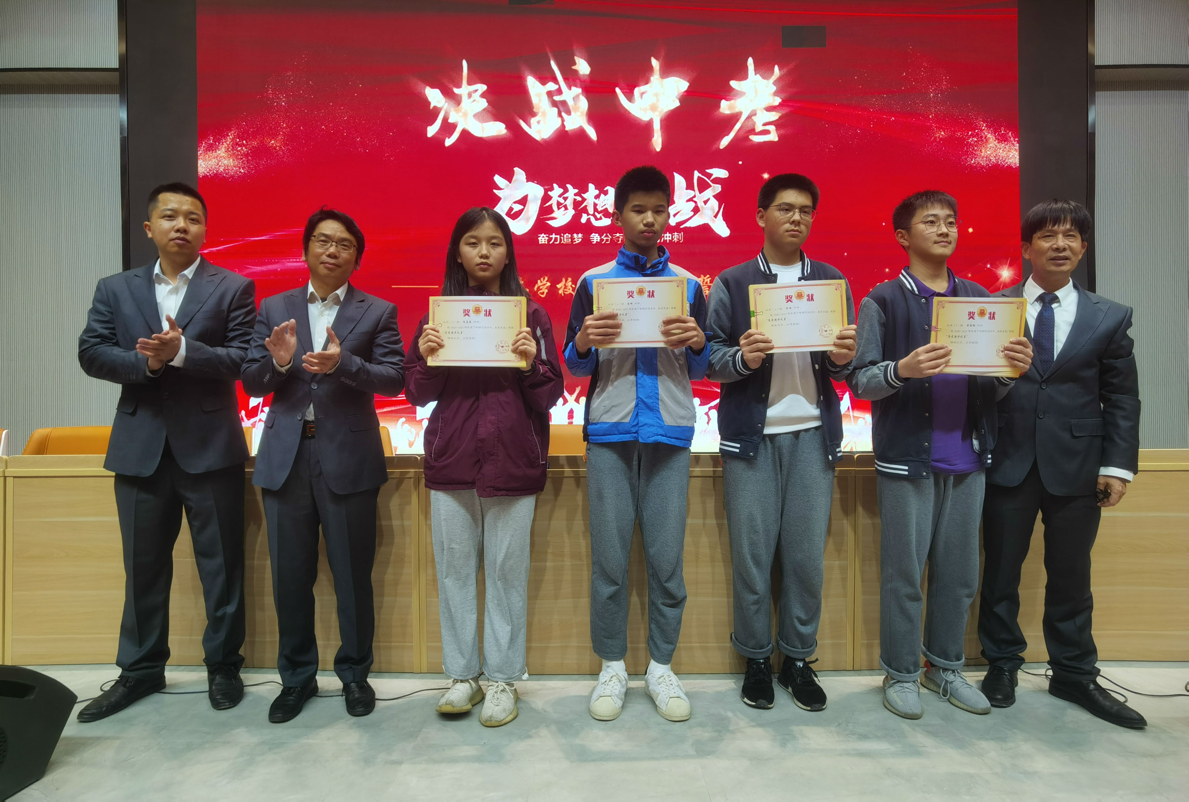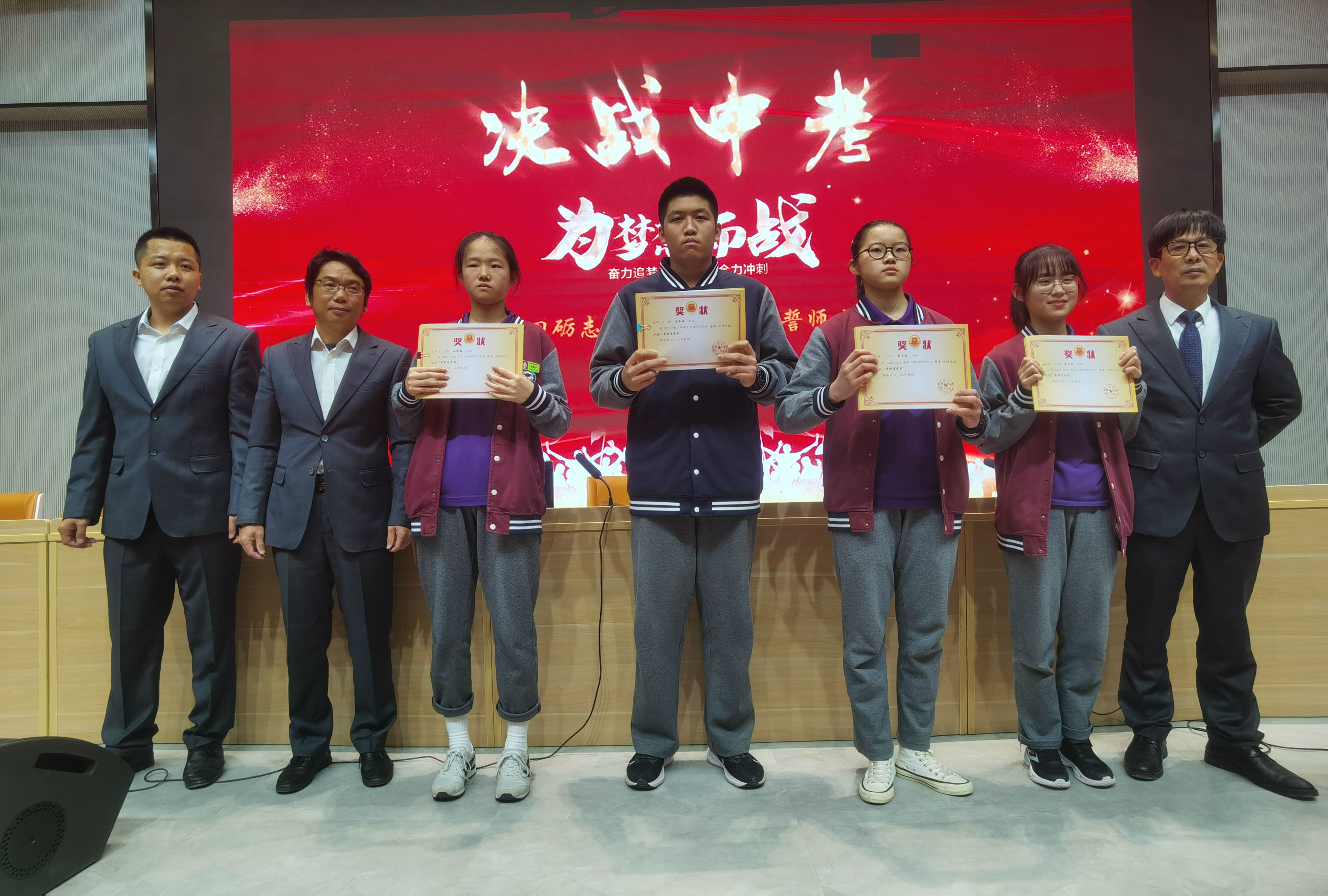 在刚刚过去的区统考中,九年级的同学们努力拼搏,换来了丰硕的成果。同学们积极进取,勤奋努力,形成了一种竞争有序、和谐发展的良好学习氛围。誓师会上,学校为在区统考取得优异成绩的同学进行表彰,分别颁发了“单科进步之星”“单科优秀奖”和“总分优秀奖”。