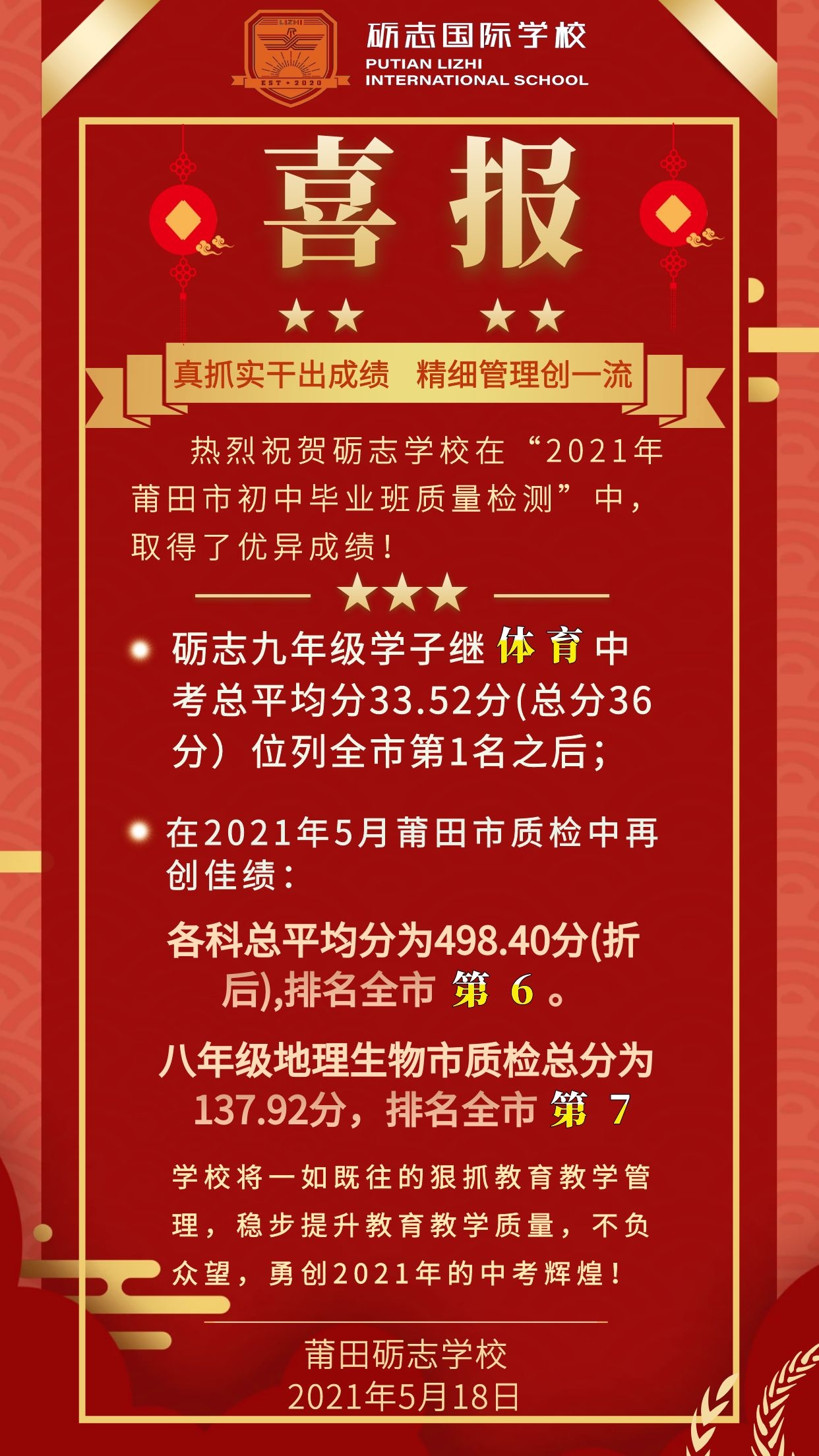 莆田砺志学校2021年初中毕业班质量检测喜报