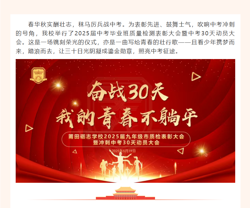 【砺志记事】“以表彰之名致敬努力,以冲刺之姿决胜中考”——莆田砺志学校2025届中考毕业班质量检测表彰大会暨中考30天动员大会