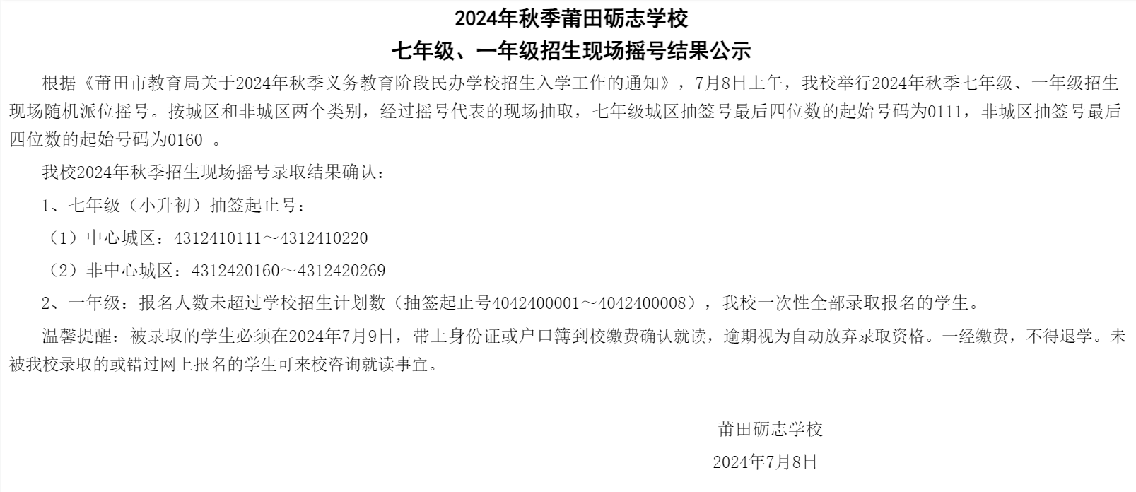 莆田砺志学校2024年秋季七年级、一年级招生报名结果公示
